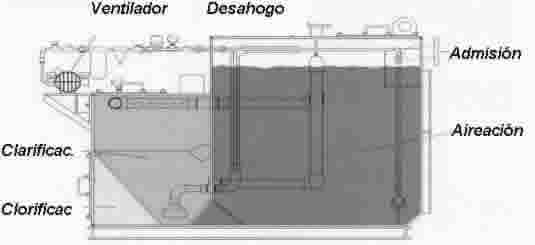 La primera operación es aireación. Las aguas residuales entran a la unidad a través de la conexión de entrada al compartimiento de